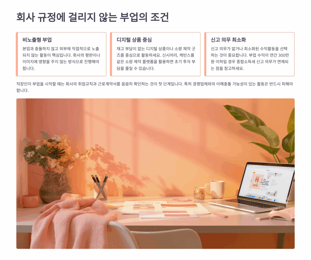 창작 활동도 좋은 선택이에요. 블로그 운영, 유튜브 채널, 전자책 출판 같은 활동들은 개인의 창작 활동으로 분류되어 회사 규정에 걸리지 않는 경우가 많아요. 실제로 제 주변에도 IT 회사에 다니면서 주말에 그림을 그려 NFT로 판매하는 친구가 있는데, 회사에서 전혀 문제 삼지 않더라구요. ????