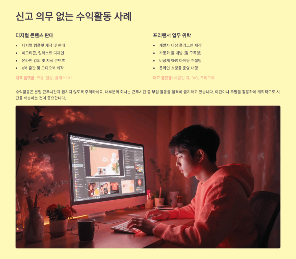 온라인 강의 제작도 추천해요. 인프런, 클래스101 같은 플랫폼에서 자신의 전문 지식을 강의로 만들어 판매하면 되는데요. 한 번 만들어두면 계속 수익이 발생하는 패시브 인컴이 되죠. 제 동료는 엑셀 강의 하나로 월 200만원씩 벌고 있어요. 회사에서도 직원의 역량 개발 활동으로 보기 때문에 오히려 긍정적으로 생각한대요.