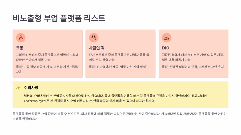 회사에 들키지 않고 부업을 하려면 비노출형 플랫폼을 활용하는 게 중요해요. 익명성이 보장되고 개인정보 노출이 최소화된 플랫폼들을 선택해야 안전하게 활동할 수 있죠. 실명이나 얼굴 노출 없이도 수익을 낼 수 있는 플랫폼들이 생각보다 많답니다. ????️
