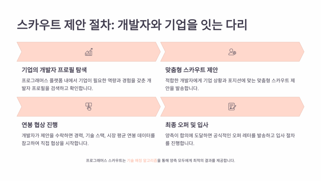 프로그래머스 스카우트 제안은 크게 5단계로 진행돼요. 먼저 기업의 리크루터나 HR 담당자가 개발자의 프로필을 검토하고, 적합성을 판단한 후 스카우트 메시지를 발송해요. 이때 포지션 정보와 예상 연봉 범위가 함께 제시되는 경우가 많답니다.