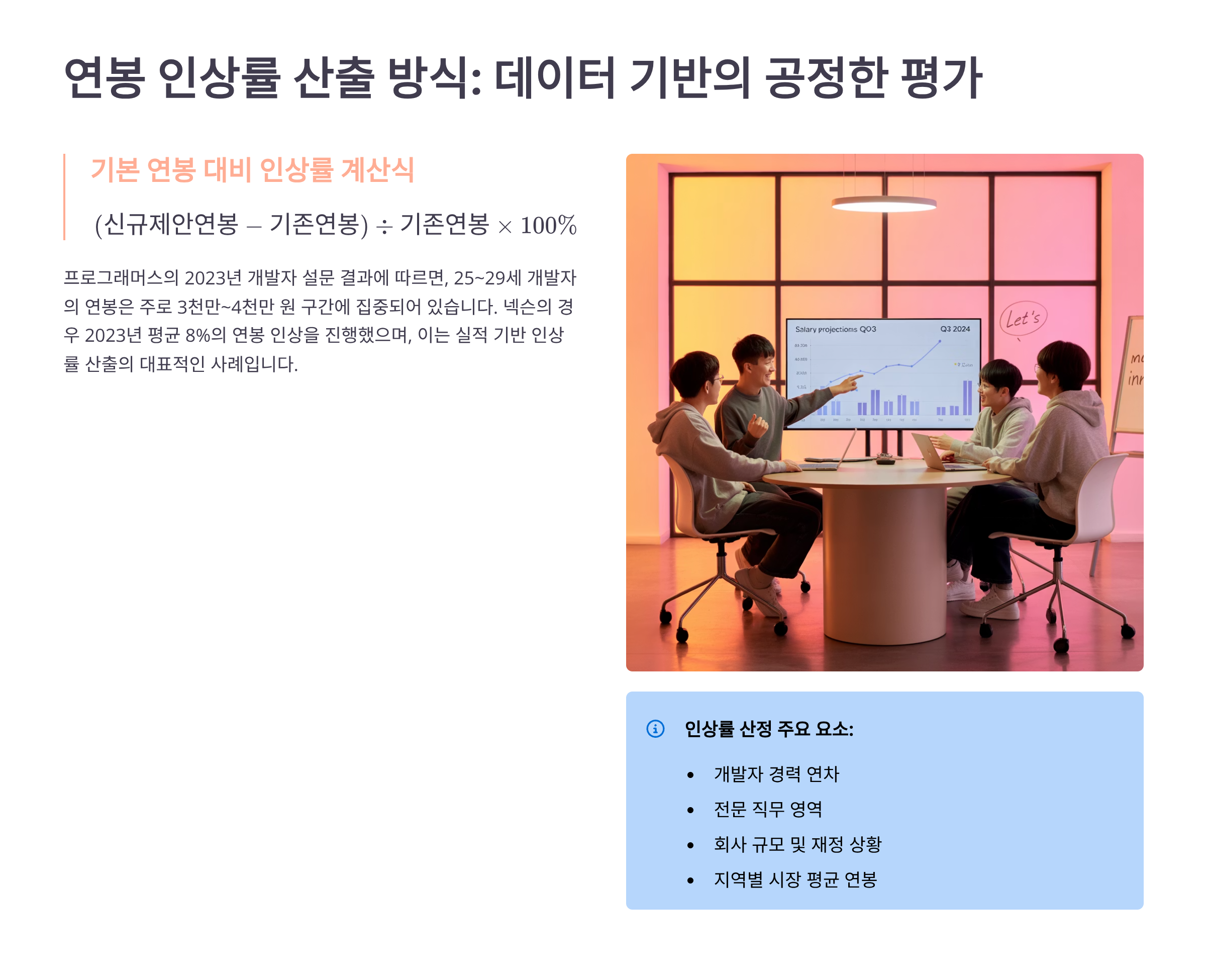 연봉 인상률 = (제안 연봉 – 현재 연봉) ÷ 현재 연봉 × 100. 시장 평균 대비 포지셔닝, 기술 희소성, 협상 타이밍이 주요 변수입니다.