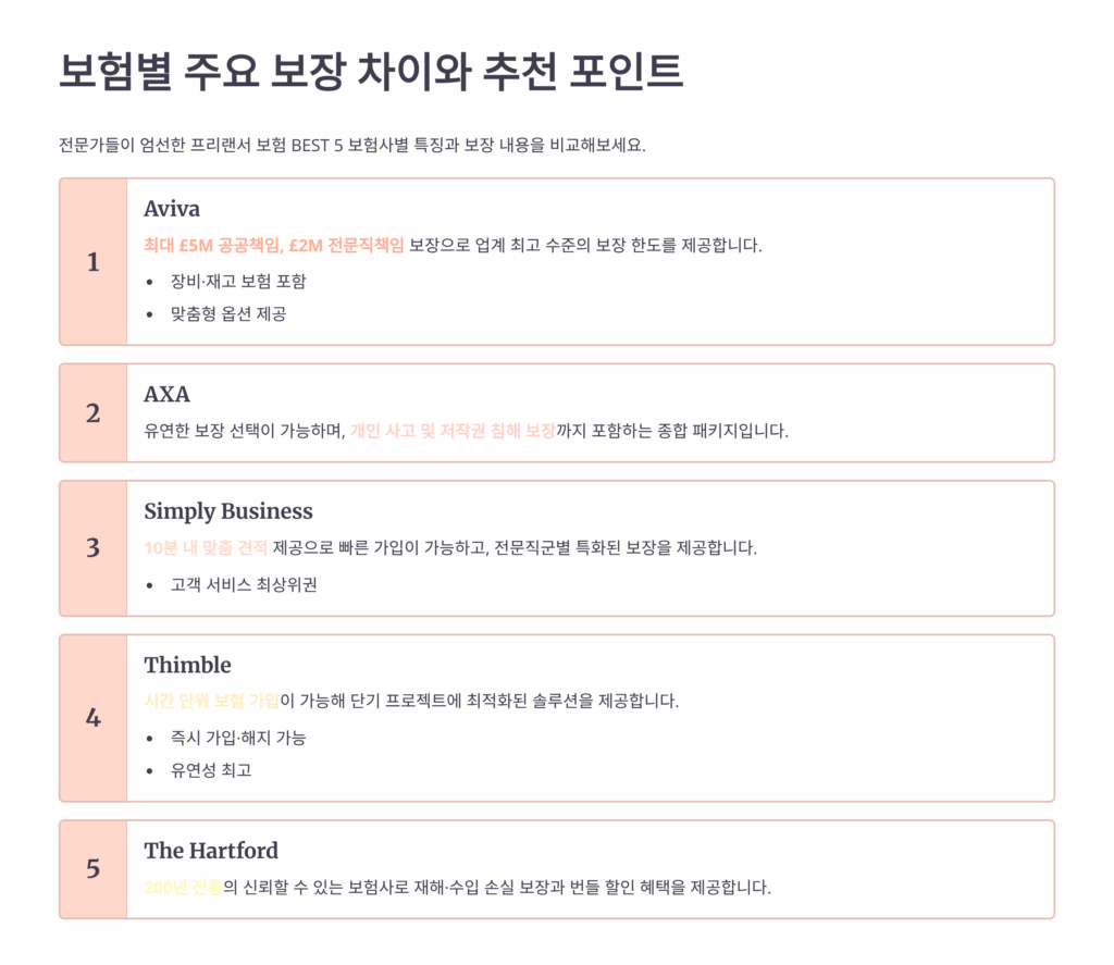 수많은 보험 상품 중에서 프리랜서에게 가장 적합한 5가지를 엄선했어요. 보장 내용, 보험료, 가입 조건, 실제 후기를 종합적으로 평가한 결과예요. 각 상품의 장단점과 어떤 프리랜서에게 적합한지 상세히 분석해드릴게요.