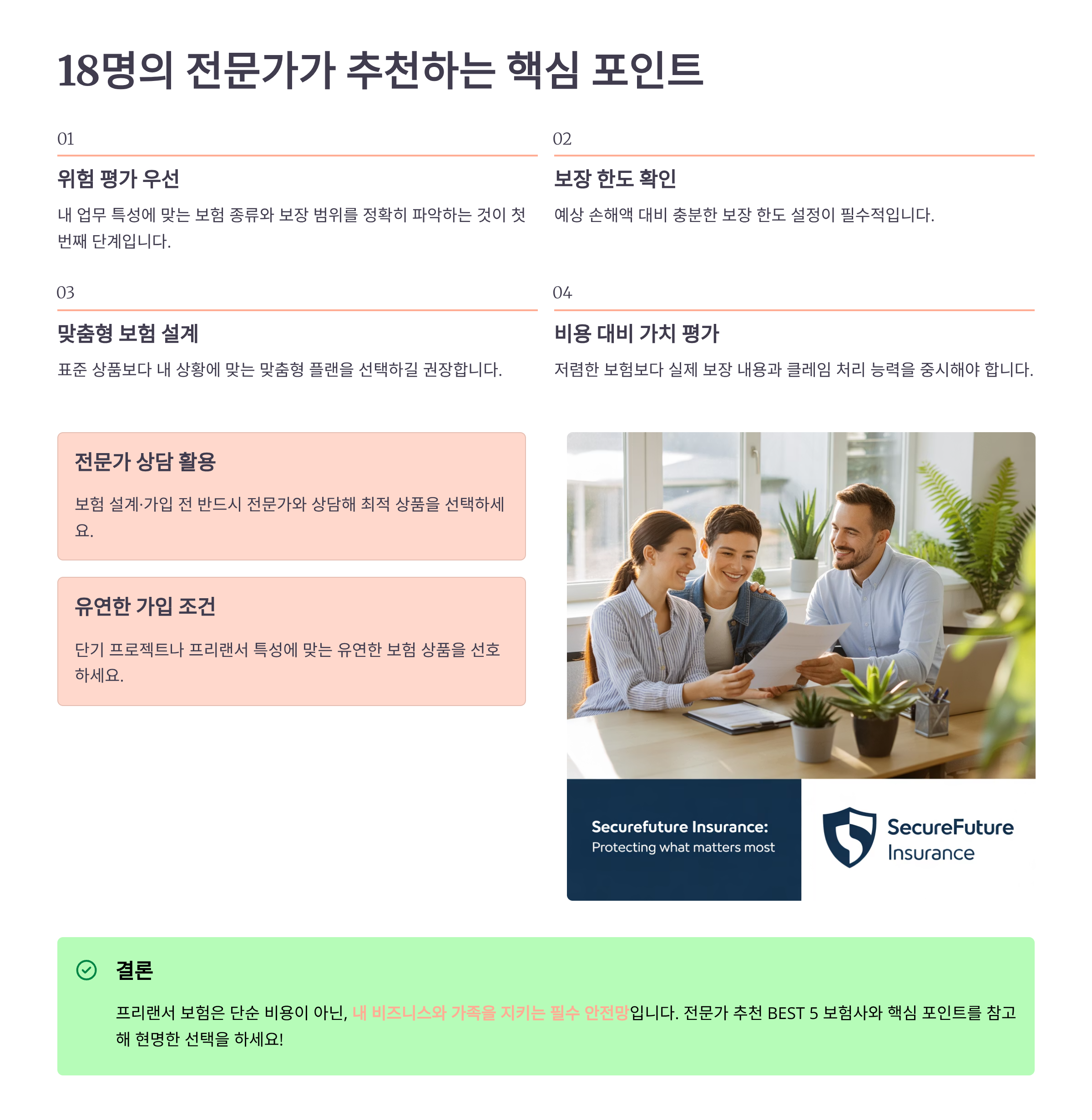 보험 전문가들과 상담하면서 가장 많이 듣는 조언은 “무작정 많이 가입하지 말고, 필요한 것만 제대로 가입하라”는 거예요. 프리랜서는 수입이 불규칙하기 때문에 보험료 부담을 최소화하면서도 핵심 리스크는 확실히 대비해야 해요. 전문가들이 공통적으로 강조하는 포인트들을 정리해봤어요.