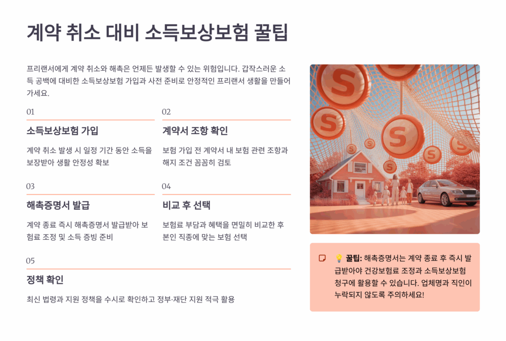 프리랜서의 가장 큰 고민은 갑작스러운 프로젝트 취소예요. 6개월 프로젝트를 시작했는데 2개월 만에 중단되면 남은 4개월은 수입이 없어지죠. 소득보상보험은 이런 상황에서 생활비를 보장해주는 안전장치예요. 실제로 코로나19 시기에 많은 프리랜서들이 이 보험 덕분에 버틸 수 있었답니다.