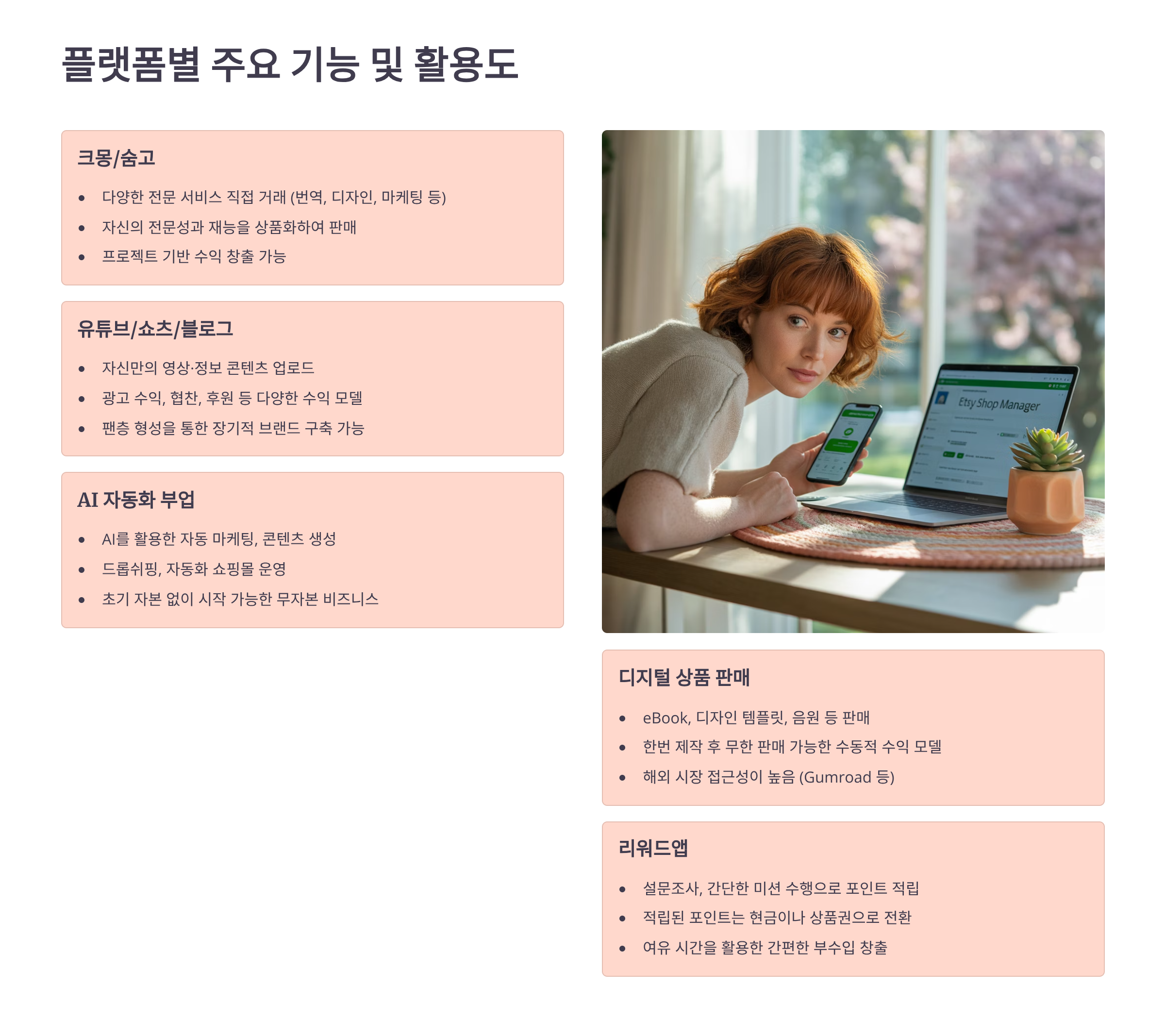 본 콘텐츠는 2025년 1월 기준으로 작성되었으며, 각 플랫폼의 정책과 수수료는 변경될 수 있습니다. 수익 관련 정보는 개인의 능력과 노력에 따라 차이가 있을 수 있으며, 본 글에서 제시한 수치는 평균적인 참고 자료입니다. 부업 시작 전 반드시 본인의 상황을 고려하여 신중히 결정하시기 바랍니다. 세금 및 법률 관련 사항은 전문가와 상담하시길 권장합니다.