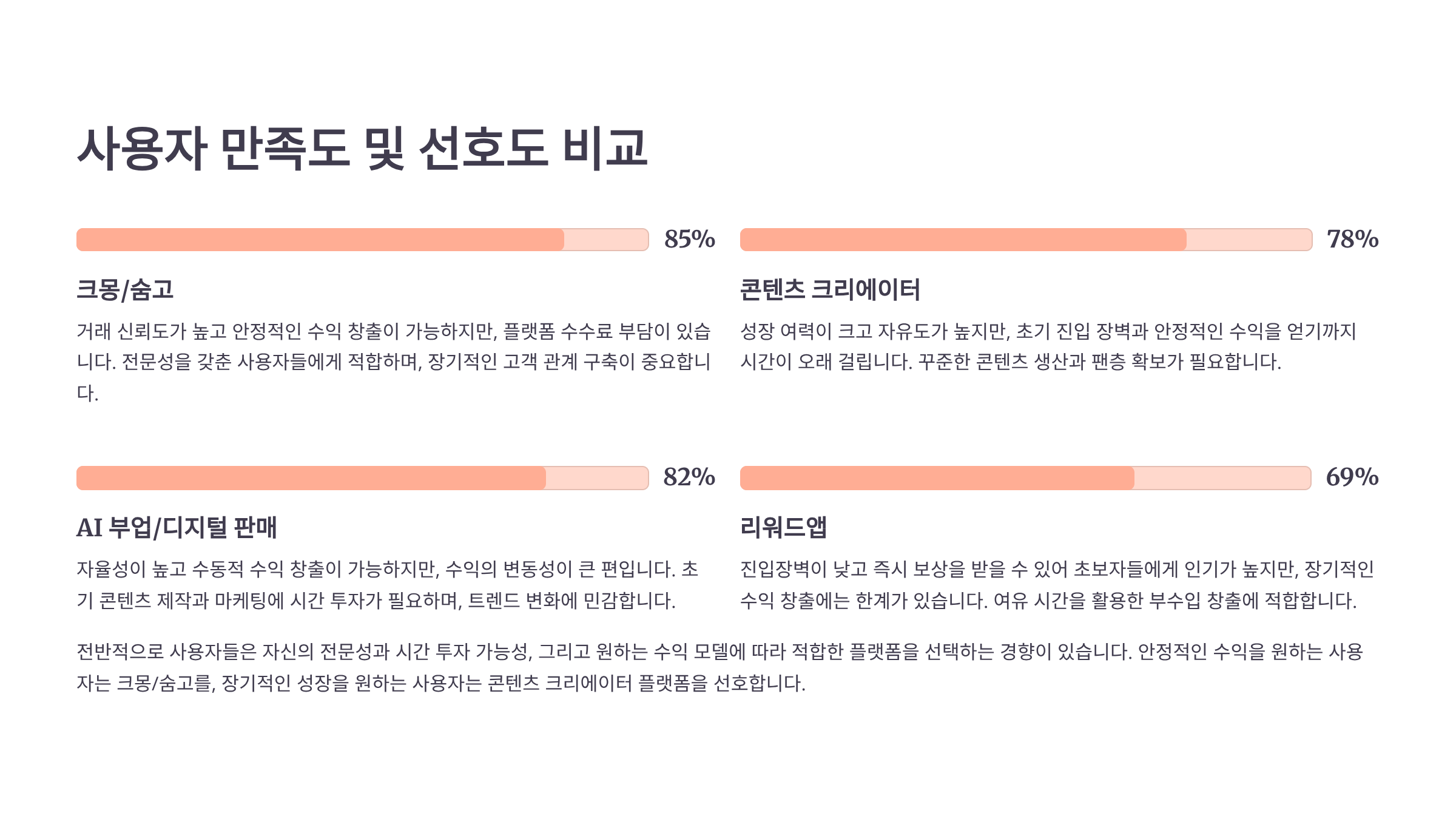 사용자들의 주요 불만 사항도 조사되었어요. 공통적으로 ‘과도한 경쟁’, ‘수수료 부담’, ‘초기 진입 장벽’ 등이 언급되었답니다. 하지만 대부분의 사용자들이 “본업과 병행하기에 적합하다”, “시간 활용이 자유롭다”, “새로운 네트워크를 형성할 수 있다”는 긍정적인 피드백을 주었어요. 특히 20-30대는 “경력 개발에 도움이 된다”는 의견이 많았답니다! ????