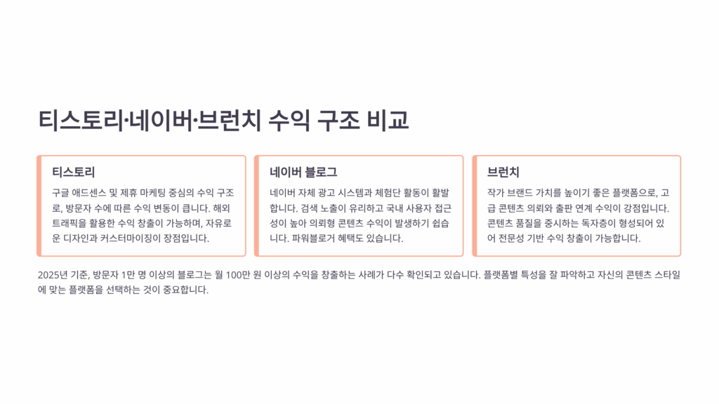 티스토리, 네이버 블로그, 브런치는 각각 다른 수익 구조를 가지고 있어요. 티스토리는 구글 애드센스를 통한 광고 수익이 주력이에요. 방문자가 광고를 클릭하거나 노출될 때마다 수익이 발생하죠. 월 방문자 1만 명 기준으로 평균 5~15만 원 정도의 수익을 기대할 수 있어요. 특히 IT나 금융 관련 콘텐츠는 광고 단가가 높아서 더 많은 수익을 올릴 수 있답니다.
