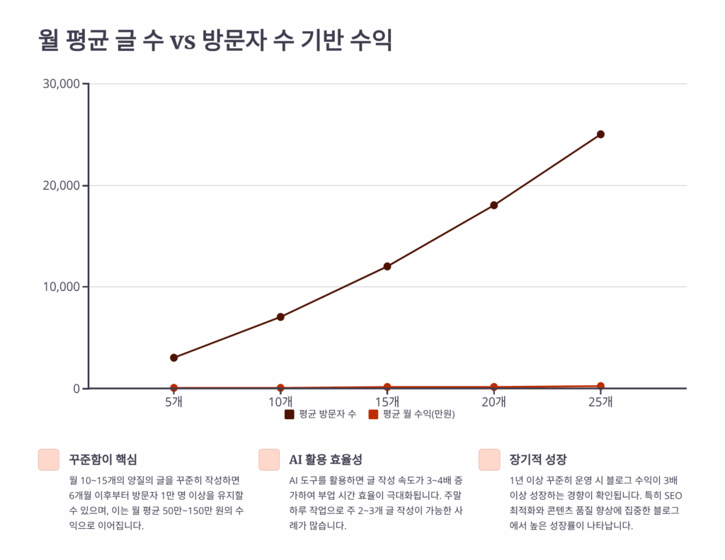 블로그 수익은 글 수와 방문자 수의 상관관계를 이해하는 것이 중요해요. 많은 분들이 글만 많이 쓰면 수익이 늘어날 거라고 생각하지만, 실제로는 방문자 수가 더 중요한 변수예요. 제가 운영하는 블로그 데이터를 분석해보니, 월 20개 글을 쓸 때와 40개를 쓸 때 방문자 증가율은 1.5배 정도였지만, 수익은 2.3배 차이가 났어요.
