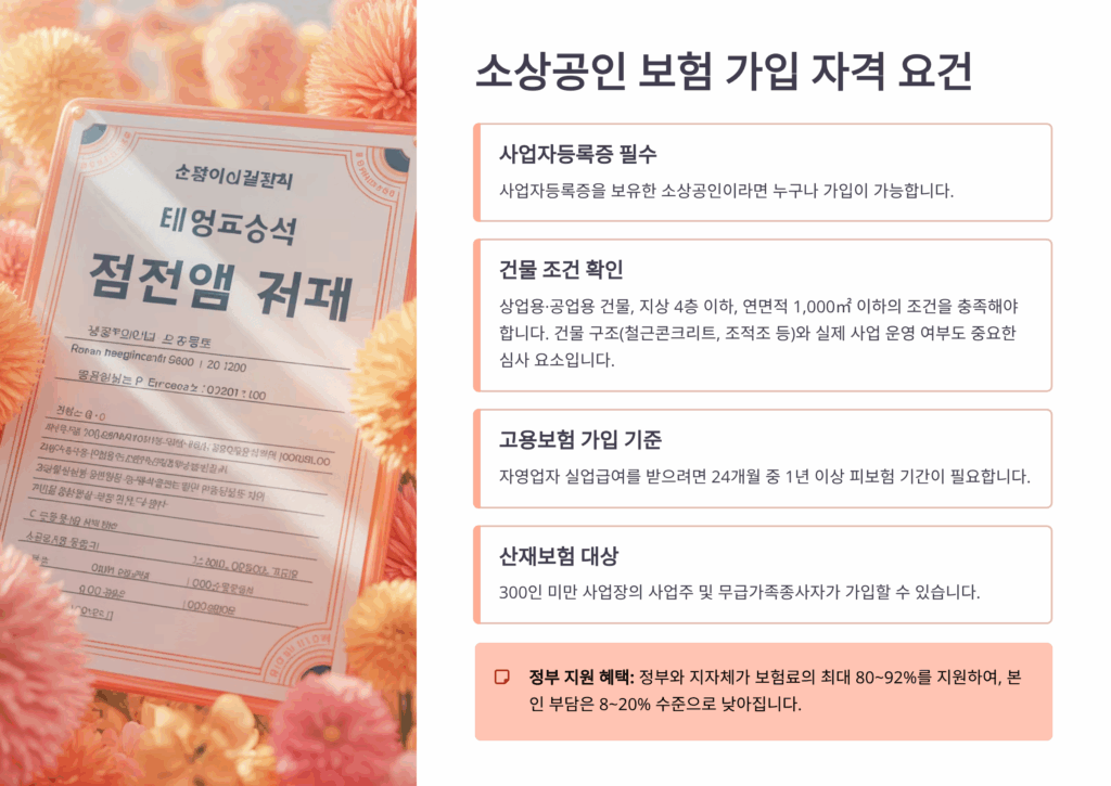 가장 중요한 건 사업자등록증이 있어야 한다는 거예요. 개인사업자든 법인사업자든 상관없지만, 사업자등록을 하지 않은 프리랜서나 특수고용직은 일반 소상공인 보험 가입이 어려워요. 대신 이런 분들을 위한 별도의 특수고용직 보험이 있으니 참고하세요.
